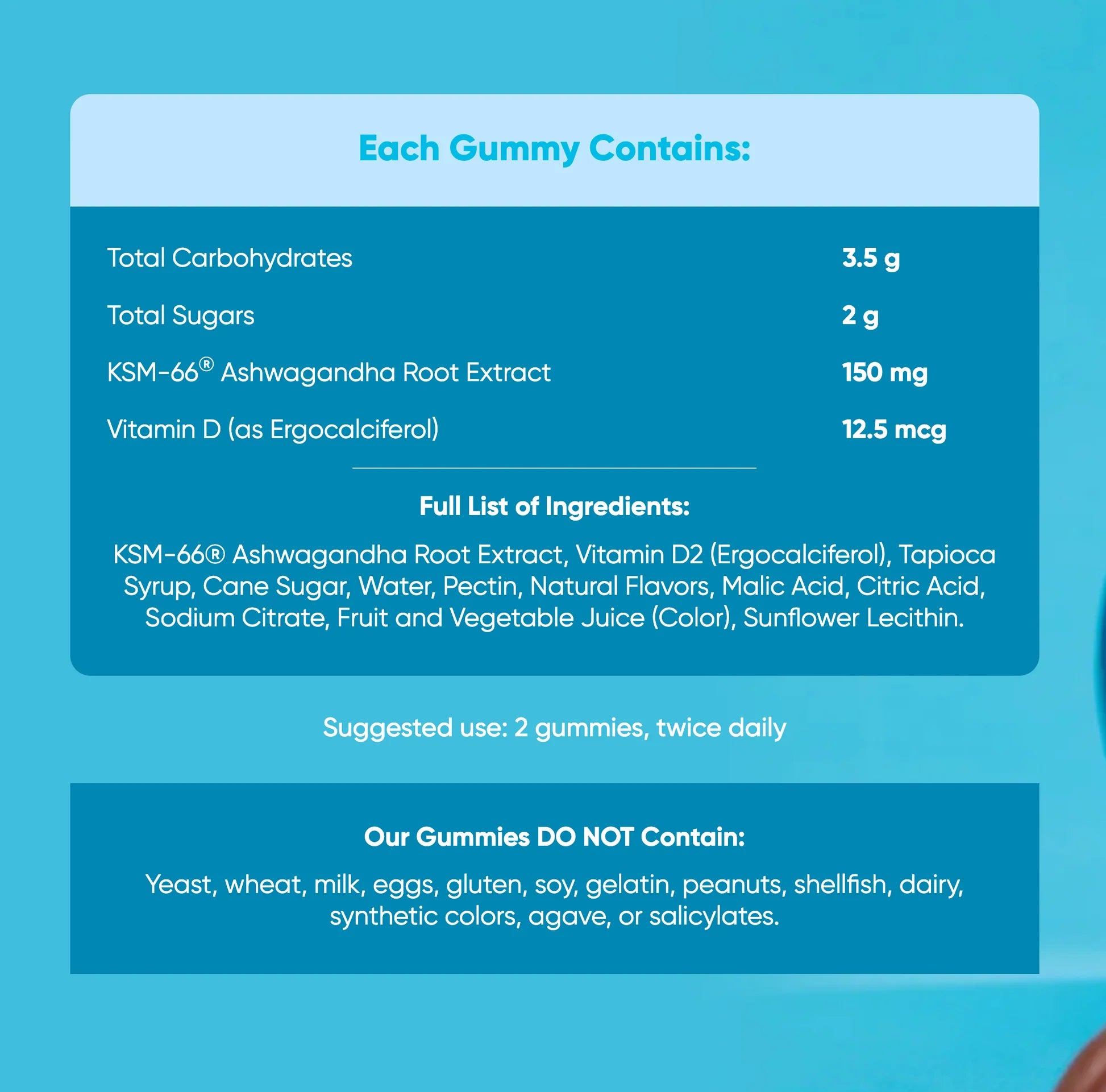Full List of Ingredients: KSM-66® Ashwagandha Root Extract, Vitamin D2 (Ergocalciferol), Tapioca Syrup, Cane Sugar, Water, Pectin, Natural Flavors, Malic Acid, Citric Acid, Sodium Citrate, Fruit and Vegetable Juice (Color),